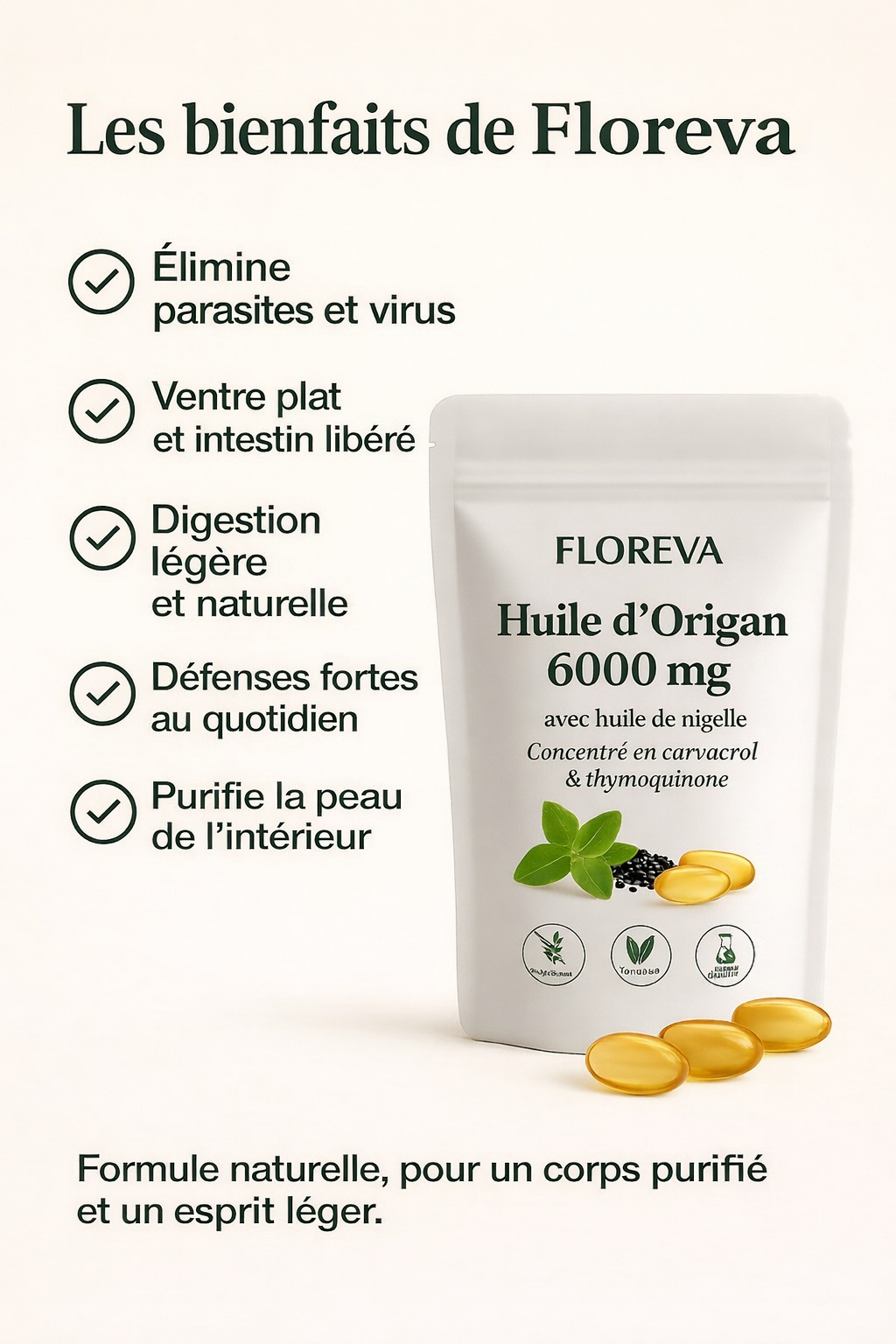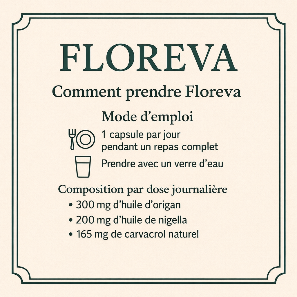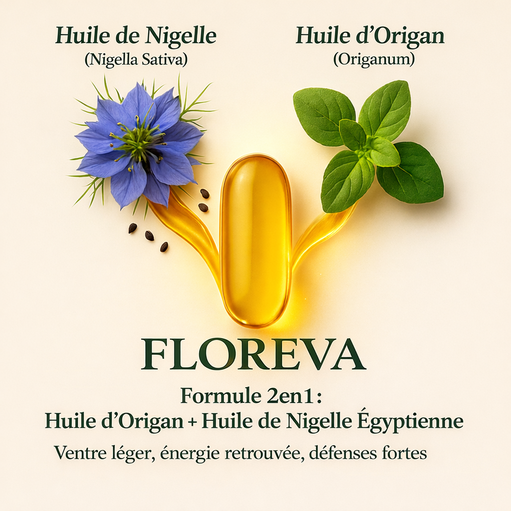 Floreva est un complément alimentaire 100 % naturel à base d’huile d’origan et d’huile de nigelle, idéal pour celles et ceux qui souhaitent améliorer la digestion, réduire les ballonnements et soutenir le système immunitaire.